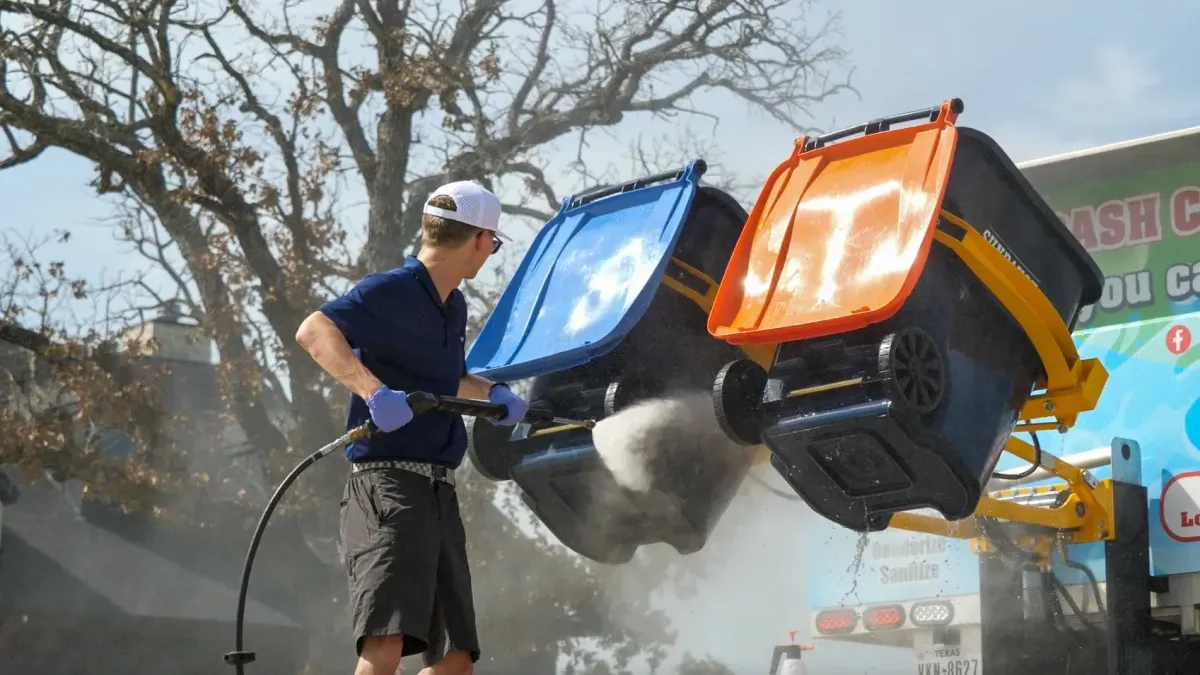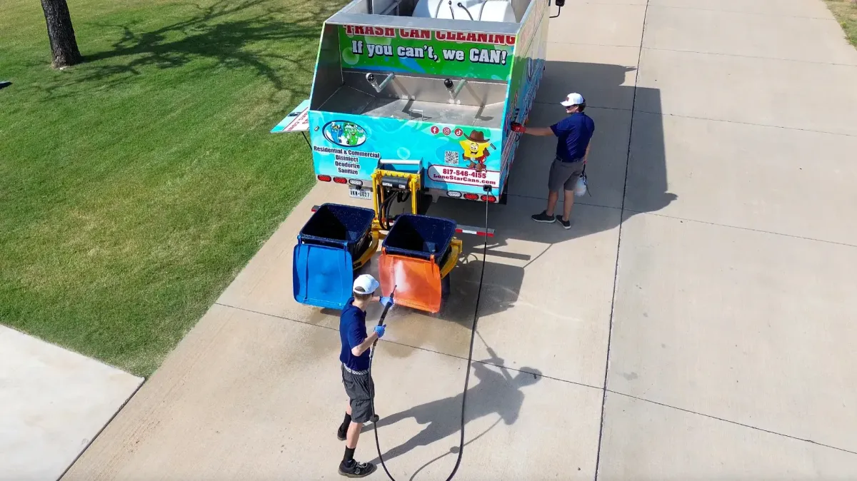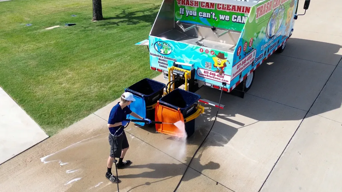 A trash can cleaning service is a professional cleaning service that washes, sanitizes, and deodorizes your trash cans and trash bins. At LoneStar Bin Cleaners, we use high-pressure water and eco-friendly products to remove dirt, grime, and bacteria. Our process lifts your bins, washes them with hot water, and leaves them super clean and fresh with no dirty water left behind.